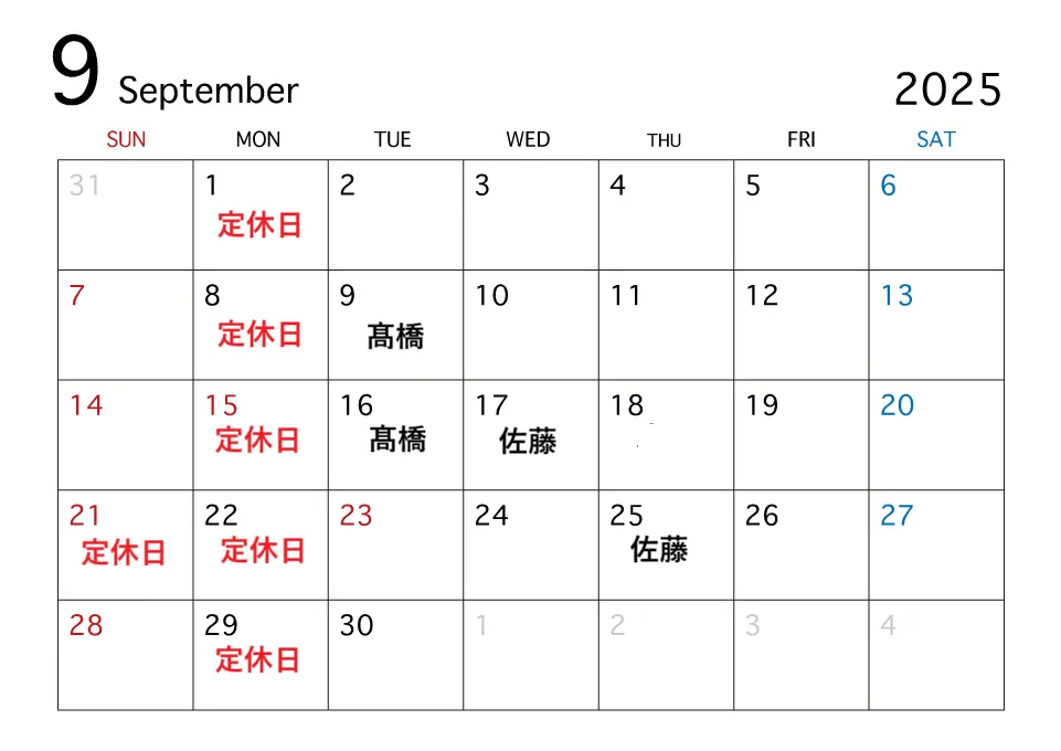 5月のスケジュール ~【毎週月曜日・第三日曜日・各スタッフ休】~5月は第3日曜日(18日)は定休日となります。☆髙橋13日・27日☆佐藤15日・22日☆関(小形)毎週日曜日・祝日※勤務時間17時(土曜日16時30分)まで。